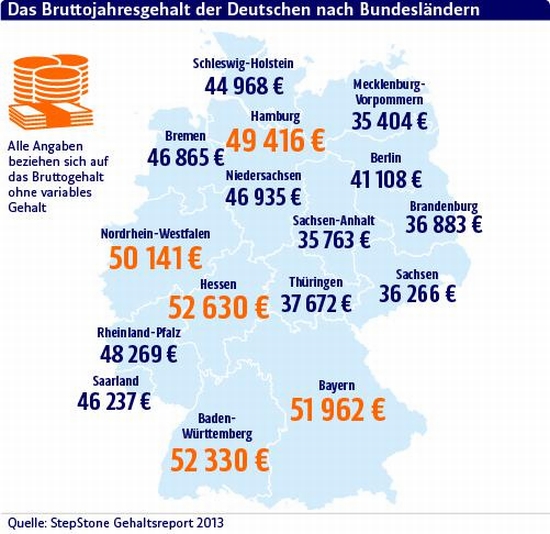 左图为各州人均年净收入,德国西部要普遍高于东部;排名前5的各州平均可达到5万欧元以上,而东部各州基本在3.6万欧元左右。相比于德国物价,他们的工资具备很大的购买力。